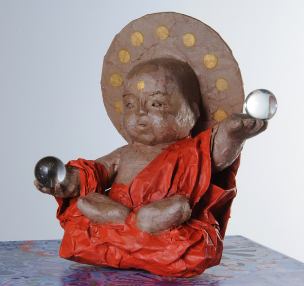 Niño monje con aureola y dos esferas
